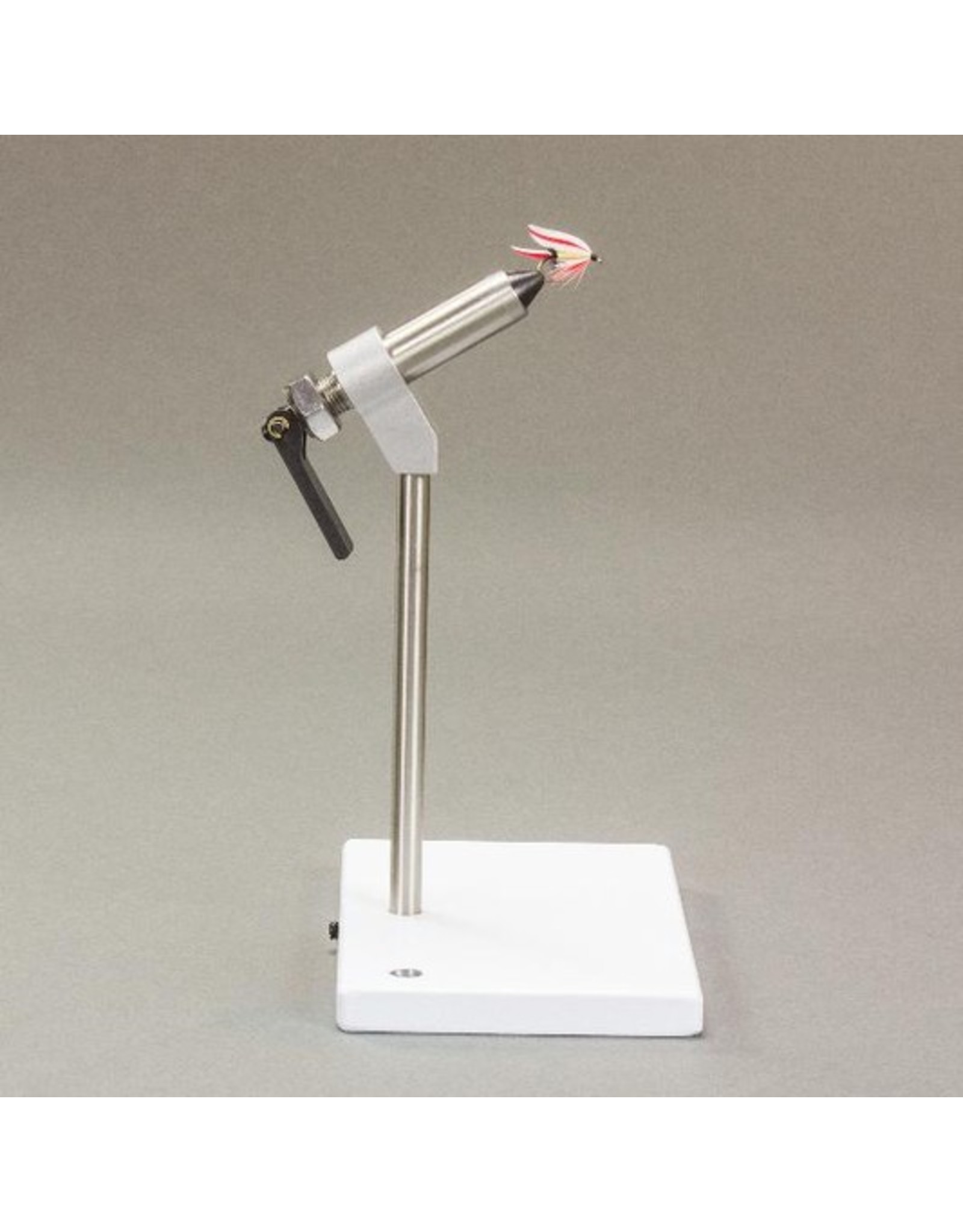 The PEAK Rotary Vise (PRV products) is designed for optimal tying efficiency and ease of adjustment and set-up. Materials (including Stainless Steel, Brass, Tool Steel, and Aircraft Aluminum) are chosen to last a lifetime. Hardened and tempered tool steel jaws hold hooks securely, from size 2/0 (depending on exact hook wire diameter) down to the smallest you can buy. Adjustments are accomplished with minimal effort. The large stable pedestal base will hold this vise where you set it, and the non-marking feet protect the surface you set it on. The steel base is powder coated white for a durable surface that provides a backdrop you can see your materials against. The base also includes an integrated hook/bead pocket with rounded edges for ease of removal, and two accessory post mounting holes (accessory post not included). The base is designed to pack flat for travel with the vise removed. The rotation resistance adjustment screw provides infinite adjustment and is easily manipulated by right or left handed tiers. A height and length adjustable bobbin cradle are supplied with the vise. Loosening a single set screw allows the vise to be removed from the base for travel.